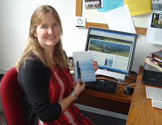 My main requirement for writing is not visual, but aural—I need silence. That’s why, when my house is overfull with the sounds of family, I sometimes retreat to my office at Washington and Lee University. There, I have orchids, children’s photos and artwork, and a big sunny window.  But the walls are drab white cinderblocks, shown in this photo taken by a local reporter, who wanted to include author, novel, and website in one picture.